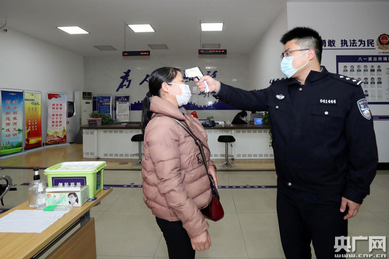 疫情期間,褚佑晨為辦事群眾測(cè)量體溫