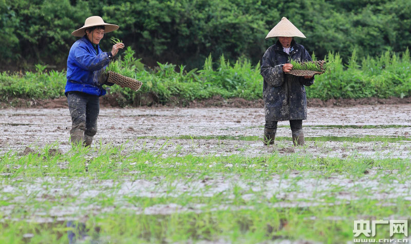 泰和縣苑前鎮(zhèn)顏家村,農(nóng)民在田間拋秧苗