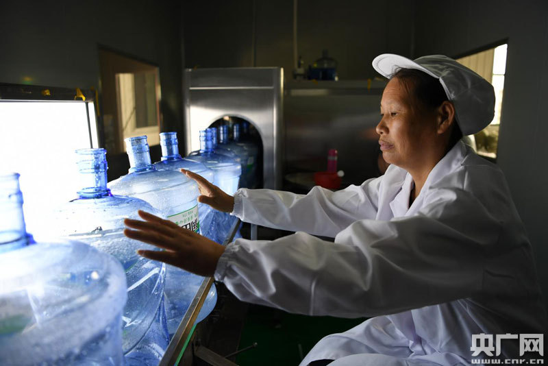 桶裝水生產(chǎn)線上,在此就業(yè)的村民正在對(duì)空水桶進(jìn)行檢查