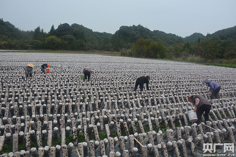 央廣網(wǎng)浮梁10月16日消息(通訊員 吳國慶)10月15日上午,浮梁縣勒功鄉(xiāng)查村村一塊大田里,一排排擺放整齊的白色菌棒十分顯眼。農(nóng)戶們有的提著籃子,有的拿著塑料桶,穿梭在菌棒之間靈巧地采摘著已成熟的黑木耳,這是查村村建檔立卡貧困戶們在為該村食用菌黑木耳種植基地勞動的場景。