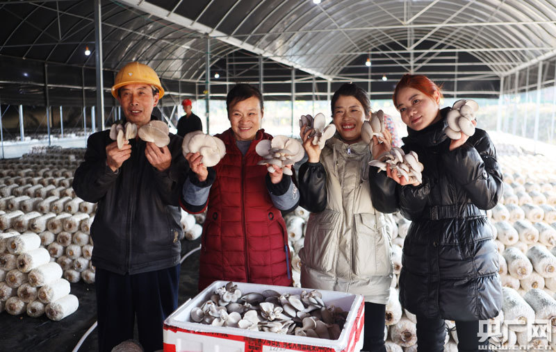 蘑菇致富車間工人在展示自產(chǎn)的蘑菇(央廣網(wǎng)發(fā) 通訊員供圖)