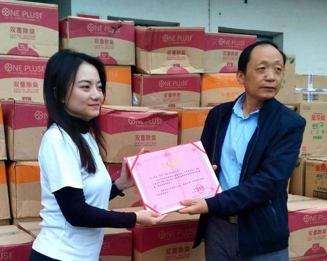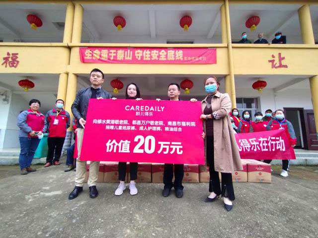 “凱兒得樂”志愿者將價(jià)值近5萬元的紙尿褲、品牌油米親手遞送到敬老院,讓馮上意感動(dòng)得不停地搓著雙手。