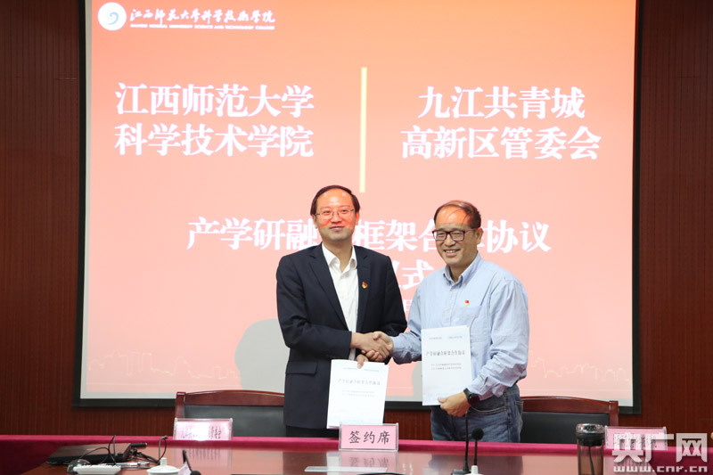 儀式上,楊龍興、李斌代表雙方簽訂合作框架協(xié)議,共青城市、高新區(qū)相關(guān)單位、企業(yè)與師大科院相關(guān)單位簽訂了7項(xiàng)專項(xiàng)合作協(xié)議。