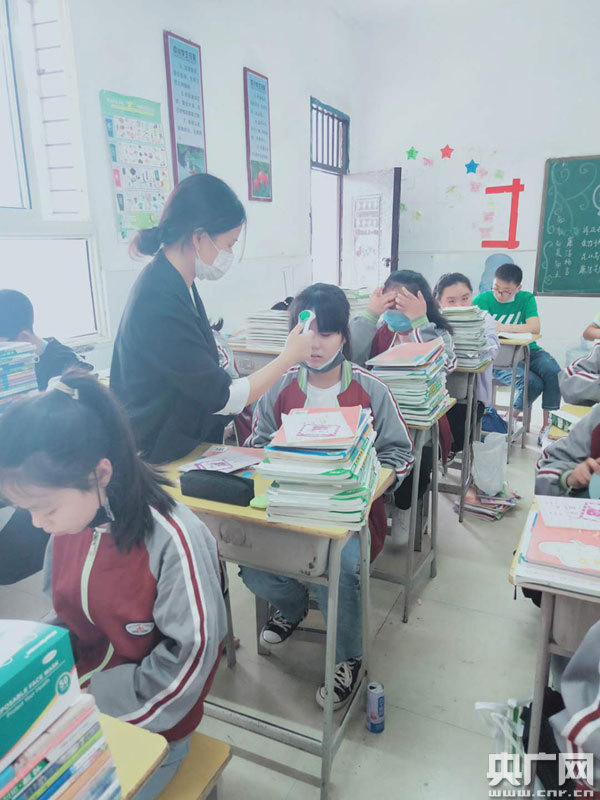 丹江學(xué)校內(nèi),老師正在給學(xué)生晨檢測溫
