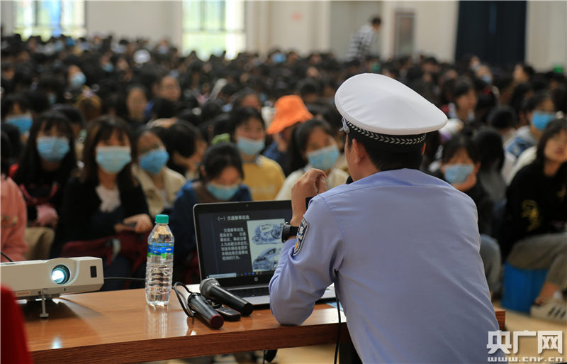 交警為大學(xué)生宣講防范交通事故知識(shí)
