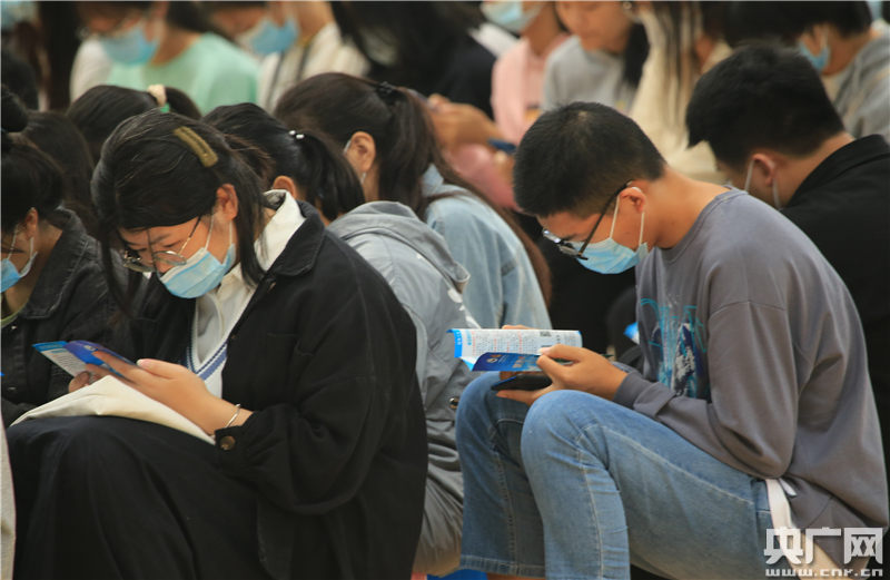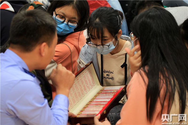 大學(xué)生在閱讀民警發(fā)放的安全知識(shí)冊(cè)頁
