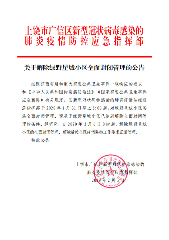 今日零時起,上饒市廣信區(qū)綠野星城小區(qū)解除全面封閉管理