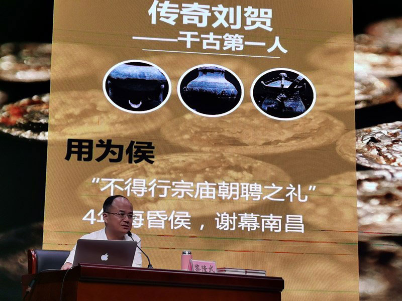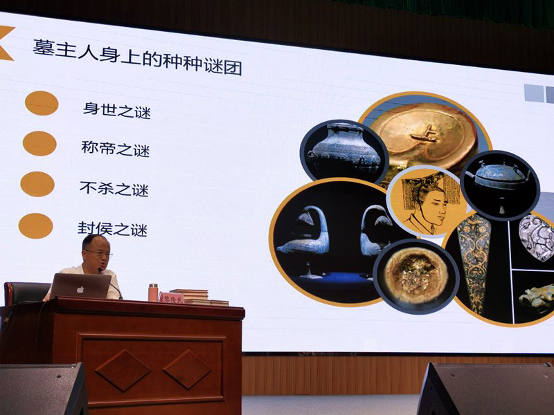 隨后,黎隆武從一個人、一座墓、一本書三個方面展開生動講解。黎隆武結(jié)合豐富的史學(xué)知識和偵探般犀利的視角,對西漢;韬顒①R的身世故事以及未解之謎給予了全新解讀,解密了一代悲催帝王侯劉賀跌宕起伏的榮辱生涯,揭開了西漢中期歷史的神秘面紗。