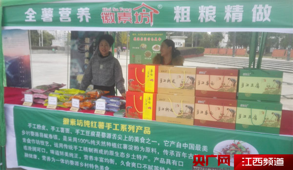 在婺源馬拉松賽事起終點(diǎn),共有23家旅游商品生產(chǎn)廠家參加了“婺馬”展銷會(huì),有正博實(shí)業(yè)、正熹堂生態(tài)農(nóng)場(chǎng)、林生實(shí)業(yè)、林香實(shí)業(yè)、華龍木雕、婺源紅酒業(yè)、清華酒業(yè)、星河酒業(yè)、曉起華聯(lián)、婺傳生態(tài)合用社、百世蜂農(nóng)、游汀天然紅薯合作社、三禾公司等企業(yè),主要有篁菊、白酒、杜仲茶、綠茶、酒糟魚、游汀紅薯粉皮系列、茄子干、土蜂蜜、麻椒布鞋、硯臺(tái)、木雕等特色旅游商品,豐富的產(chǎn)品深受縣外參賽選手青睞。