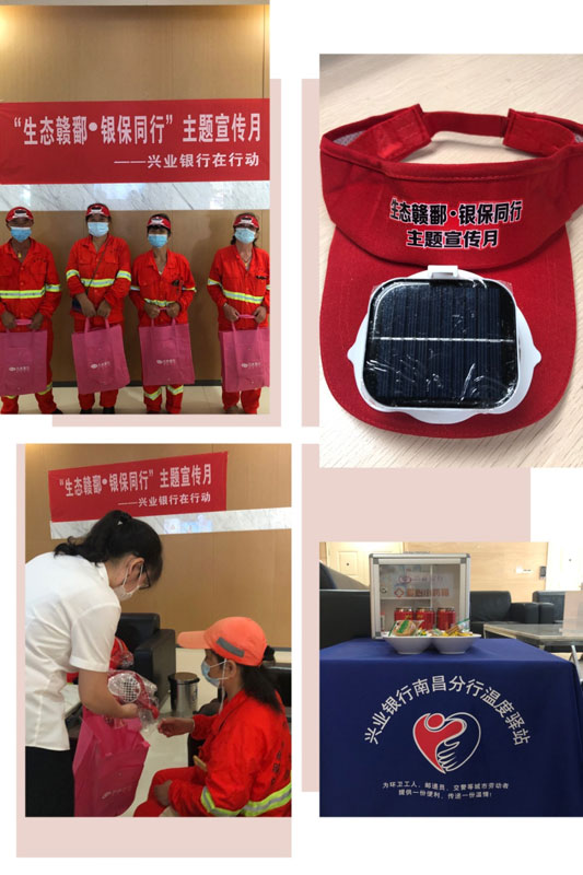 興業(yè)銀行南昌分行在分行營業(yè)部“溫度驛站”開展綠色公益活動,向環(huán)衛(wèi)工人贈送太陽能風扇帽,介紹太陽能風扇帽的優(yōu)點及使用方法,為環(huán)衛(wèi)工人送去了一份綠色的涼意。