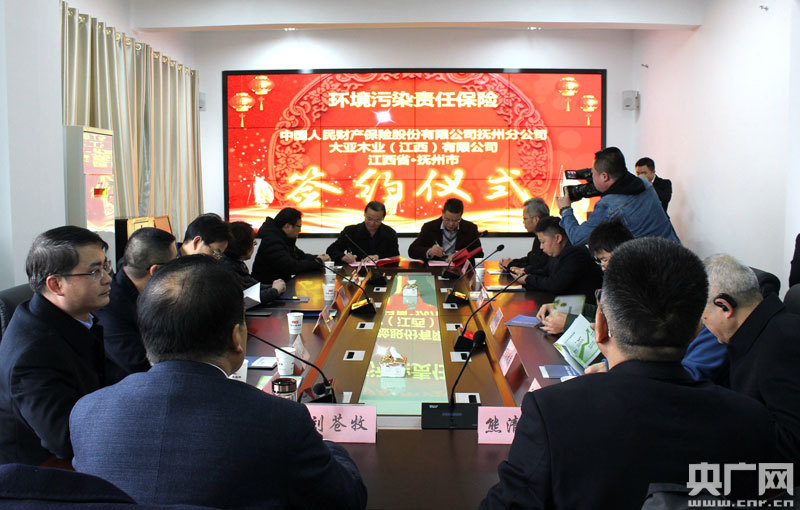 江西大亞木業(yè)與人保財險撫州市分公司雙方代表共同簽署環(huán)境污染責任險協(xié)議書,成為綠色保險創(chuàng)新實驗室正式成立后簽出的綠色保險第一單。