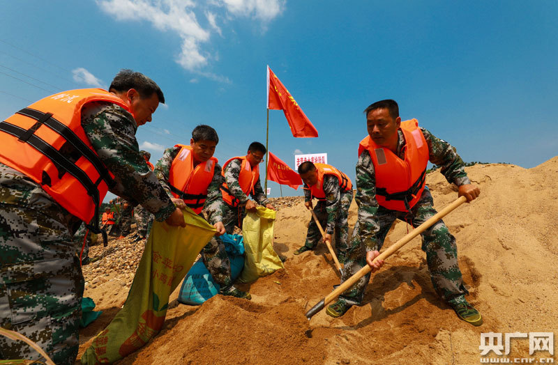 5月8日,江西省吉安市泰和縣舉行山洪災(zāi)害防御預(yù)案聯(lián)合演練,應(yīng)急搶險(xiǎn)隊(duì)員正在演練裝運(yùn)沙石等搶險(xiǎn)物質(zhì)