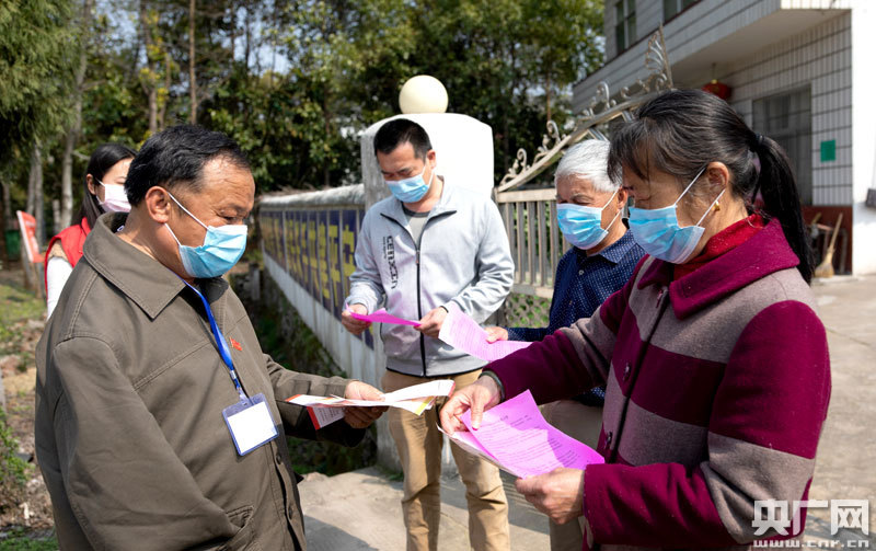 陽昌紹向村民發(fā)放防疫宣傳資料