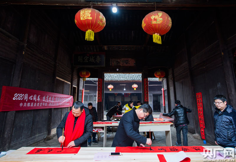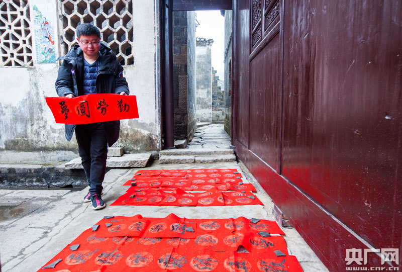 央廣網(wǎng)九江1月19日消息(記者王一凡 通訊員傅建斌)春節(jié)臨近,江西省九江市都昌縣開展“迎新春送萬福進萬家”文化活動,組織書法文藝志愿服務隊來到蘇山鄉(xiāng)鶴舍古村為村民書寫春聯(lián),送上節(jié)日的祝!,F(xiàn)場,書法家揮毫撥墨,村民們忙著挑選春聯(lián),歡聲笑語中透著濃濃的年味。