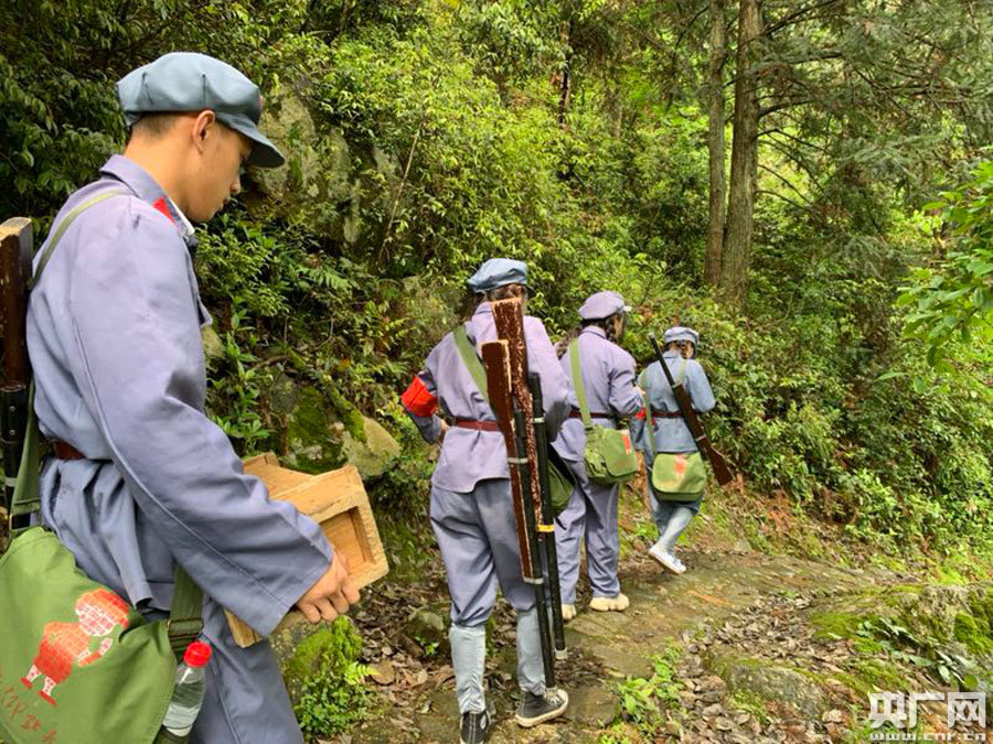 在茅坪鄉(xiāng)壩上村茂密的竹林中,我遇上了一支身著紅軍服,肩扛彈藥箱的行軍隊(duì)伍,村民告訴我,這不是拍電影電視,而是全國(guó)青少年井岡山革命傳統(tǒng)教育基地在他們壩上村開展的體驗(yàn)教學(xué)課程——“紅軍的一天”。