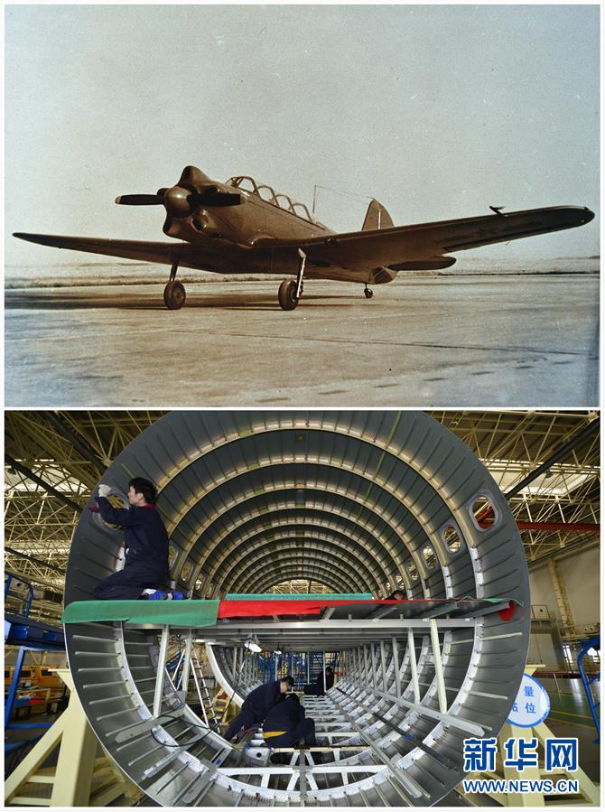 拼版照片:上圖為國營洪都機(jī)械廠(今中航工業(yè)江西洪都航空工業(yè)集團(tuán)有限責(zé)任公司)研制的新中國第一架飛機(jī)雅克-18型(初教5)(資料照片);下圖為中航工業(yè)江西洪都航空工業(yè)集團(tuán)有限責(zé)任公司工人在車間內(nèi)組裝國產(chǎn)大飛機(jī)C919機(jī)身部分(2015年11月2日新華社記者周密攝)。新華社發(fā)