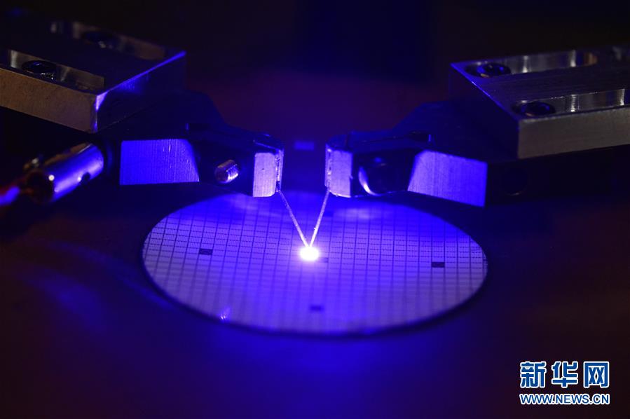 在南昌大學(xué)的LED實驗室內(nèi),一片硅襯底LED芯片發(fā)出了明亮的藍(lán)光(2016年1月1日攝)。 新華社記者 周密 攝
