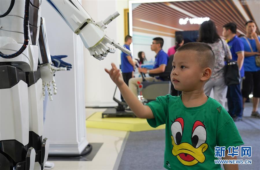 在江西鷹潭舉行的2019江西國際移動物聯(lián)網(wǎng)博覽會上,一名小觀眾在和機(jī)器人“握手”(7月18日攝)。新華社記者 周密 攝