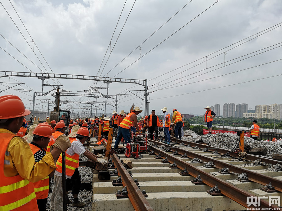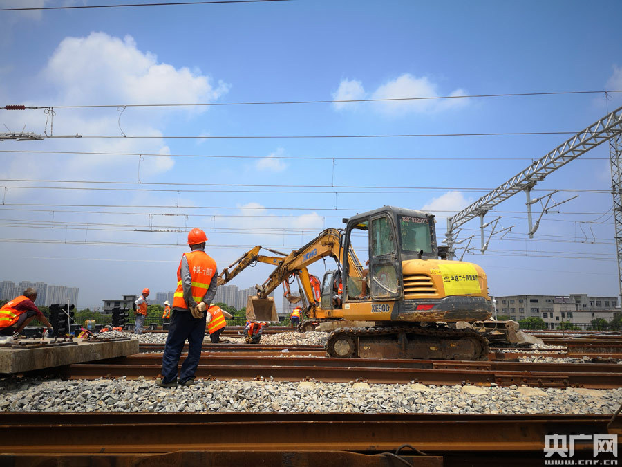 謝元森:我現(xiàn)在就是在位于南昌市郊區(qū)的昌贛高鐵施工現(xiàn)場(chǎng),在我身后,南昌西動(dòng)車二所咽喉區(qū)改造施工項(xiàng)目正在火熱進(jìn)行中,今天南昌依然是桑拿天,目前氣溫接近35攝氏度,我用手摸一下地面的鐵軌,立馬感覺到滾燙的灼燒感。在今天的施工現(xiàn)場(chǎng),有一千多名鐵路施工人員奮戰(zhàn)在這里,他們首先要拆除既有的鐵軌線路,再鋪設(shè)新軌,最后和既有道岔精準(zhǔn)對(duì)位,這項(xiàng)工作技術(shù)要求高,工程量大。施工人員告訴我,這里是進(jìn)出動(dòng)車所的咽喉區(qū),改造后由兩線轉(zhuǎn)換升級(jí)成四線轉(zhuǎn)換,將大大地提高動(dòng)車所的存車能力與檢測(cè)功能,為昌贛客高鐵底開通提供有力保障。