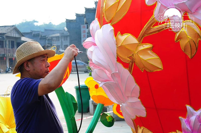 美工現(xiàn)場(chǎng)美化以景德鎮(zhèn)紅釉花瓶等比例放樣的《錦繡河山》主題彩燈