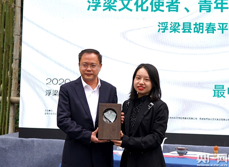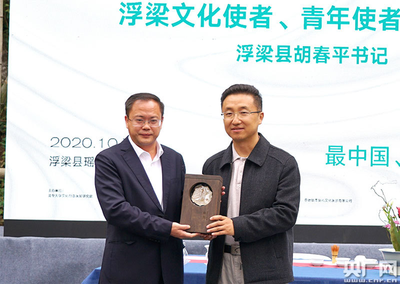 胡春平為胡鈺頒發(fā)“浮梁文化使者”紀念牌(央廣網發(fā) 通訊員李金龍)