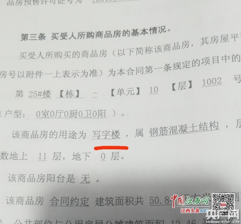 4月20日,南昌新力公園壹號業(yè)主徐女士向中國江西網(wǎng)(江西頭條客戶端)記者反映,2018年4月,她在新力公園壹號購入一套商品房“公寓”。2019年9月,在付完首付拿到合同時卻發(fā)現(xiàn)合同上商品房用途為“寫字樓”,不僅不能用于居住用途,宣傳所說的能落戶也成泡影。