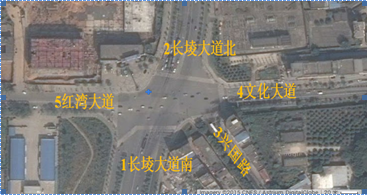 該交叉口位于江西省南昌市新建區(qū)中心城區(qū)西部。由長(zhǎng)堎大道、紅灣大道、文化大道、興國(guó)路五路交叉組成。其中長(zhǎng)堎大道南北方向雙向六車道主干道,紅灣大道、文化大道是連接新建區(qū)和灣里區(qū)的主要交通干道,興國(guó)路連接新建區(qū)中心城區(qū)并設(shè)有多條公交線路。該交叉處在新建區(qū)大力開發(fā)地段,周邊居民區(qū)密集、各道路沿途設(shè)有多家商業(yè)和購物中心,并輻射周邊的高校園區(qū)和工業(yè)園區(qū)。由于交叉口交通流量較大、多路相交,加上長(zhǎng)堎大道建成通車后未能對(duì)交叉口各進(jìn)出口道和內(nèi)部空間進(jìn)行科學(xué)合理的交通渠化設(shè)計(jì),導(dǎo)致交通混行,交通擁堵現(xiàn)象經(jīng)常發(fā)生。交叉口現(xiàn)狀如圖-1所示。