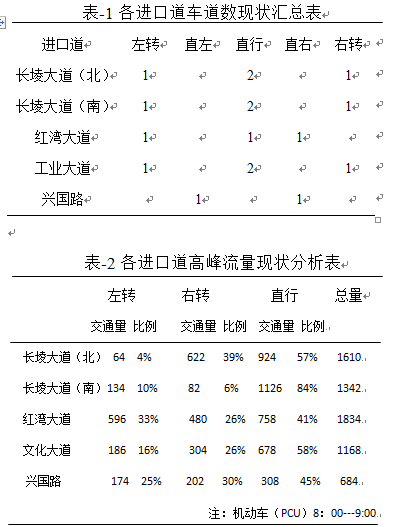 該交叉口各進(jìn)口道車道設(shè)置和流量現(xiàn)狀表-1和表-2所示。由表-2可知,長(zhǎng)堎大道和紅灣大道交通流量較大。實(shí)際調(diào)查中大中型車輛所占比例達(dá)到30%左右均集中在長(zhǎng)堎大道和紅灣大道。
