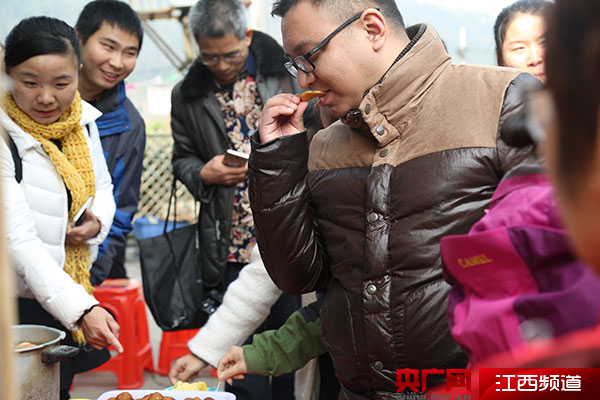 采訪團(tuán)和旅游團(tuán)在品嘗當(dāng)?shù)靥厣〕?/p>