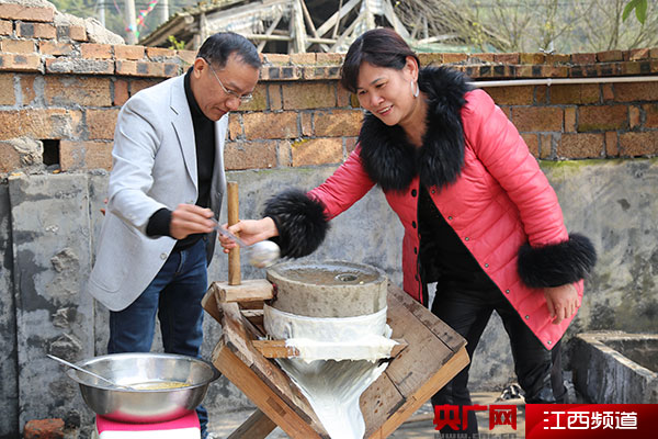 村民為游客展示磨豆腐