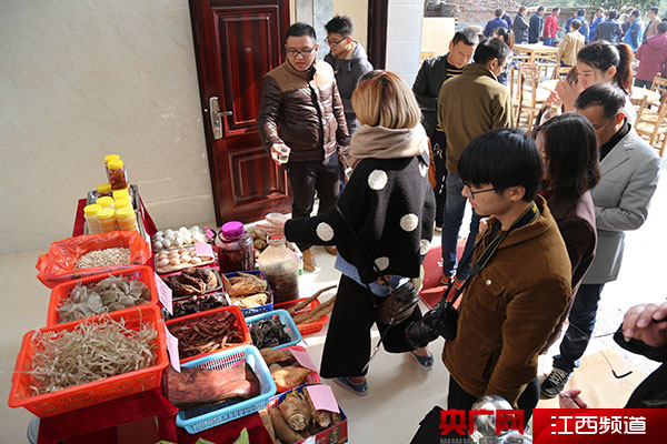 農(nóng)家樂(lè)老板為采訪團(tuán)介紹當(dāng)?shù)靥禺a(chǎn)