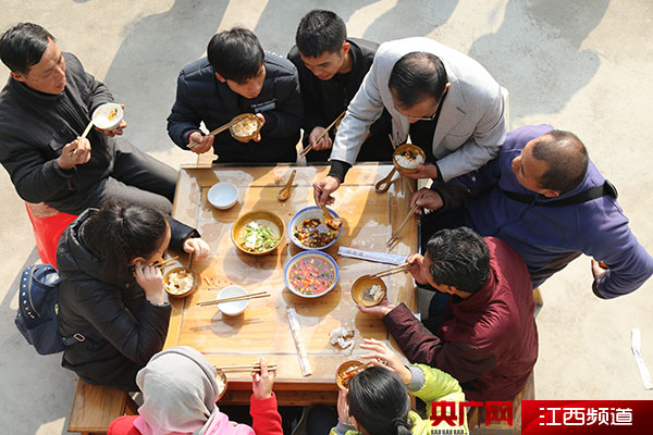 農(nóng)家樂(lè)里游客們圍坐在一起吃午餐