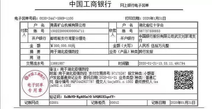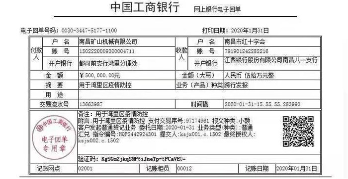 2020年元月31日,南昌市人大代表,灣里區(qū)人大常委會委員龔友良同志代表南昌礦山機械股份有限公司分別向湖北省紅十字會、南昌市紅十字會各捐款五十萬元,定向用于湖北省新型冠狀病毒肺炎防疫防控工作、灣里區(qū)新型冠狀病毒肺炎防疫防控工作。南昌礦山機械股份有限公司在捐款的同時,堅決落實《江西省人民政府辦公廳關(guān)于延遲省內(nèi)企業(yè)復(fù)工的通知》。