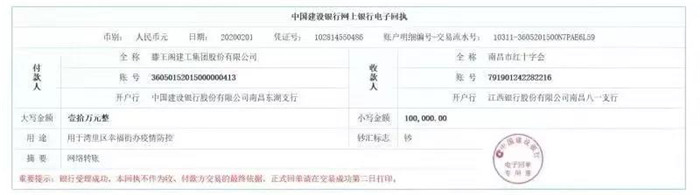 滕王閣建工集團股份有限公司黨支部書記、灣里區(qū)人大代表、滕王閣建工集團股份有限公司董事長高建壽同志代表滕王閣建工集團股份有限公司向南昌市紅十字會捐款10萬元,定向用于灣里區(qū)幸福街道新型冠狀病毒肺炎防疫防控工作。