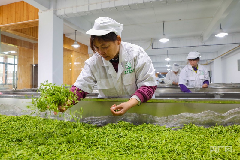 在園內,游客與茶農正一同采摘明前茶。采摘后的鮮葉,再集中送至工廠按一定厚度均勻攤青,保證其通風透氣。由于今年氣溫回升較快、雨水充足,當?shù)孛髑安璁a量和品質明顯優(yōu)于往年,各地茶園紛紛開足馬力投入明前茶的生產,供應市場。