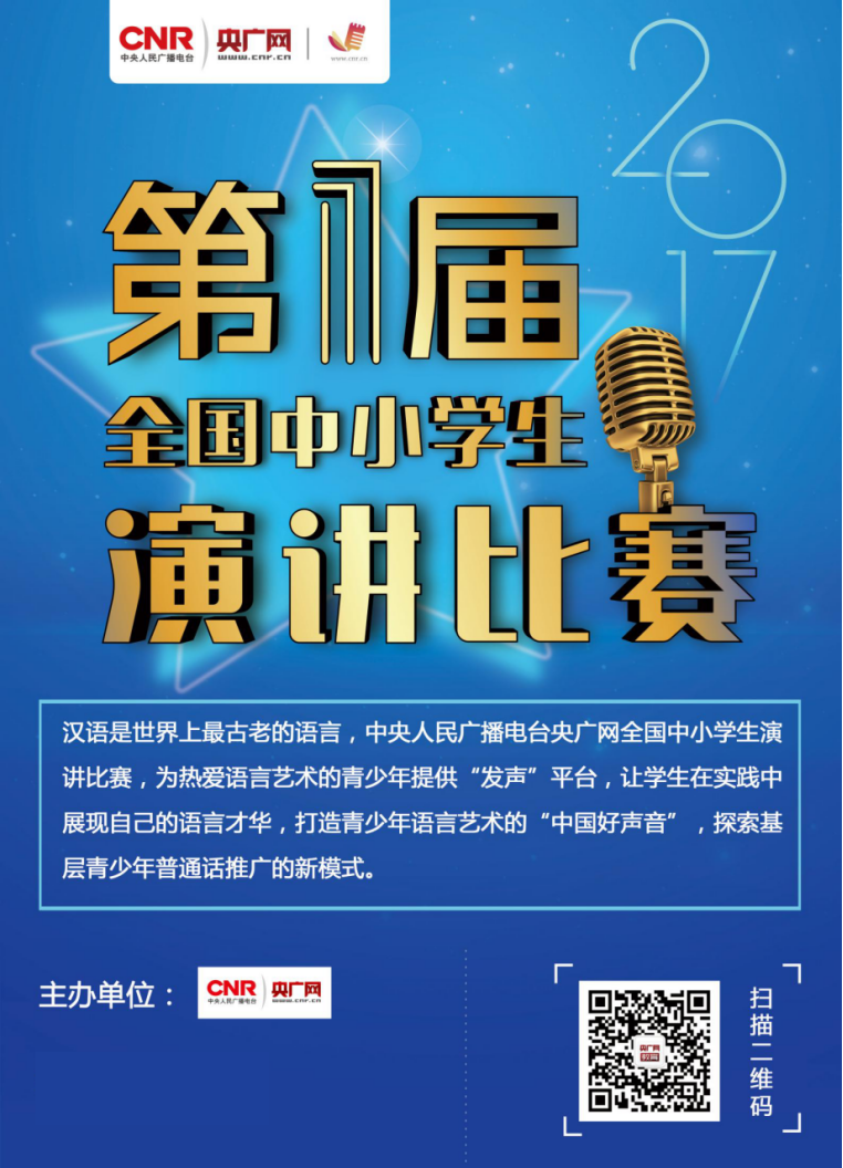 央廣網(wǎng)北京6月22日消息 文化強國,語言先行。由中央人民廣播電臺央廣網(wǎng)主辦的第一屆全國中小學生演講比賽于本月全面啟動。本次活動旨在弘揚中華民族悠久的語言文化,引導全國范圍內(nèi)在校生學習、理解中華民族優(yōu)秀傳統(tǒng)文化的內(nèi)涵和魅力,提高學生們的文化修養(yǎng)和道德修養(yǎng),在全國范圍內(nèi)的切磋學習中傳遞語言正能量。