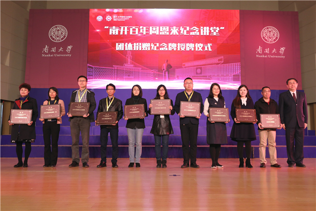 2016年12月,在南開大學百年校慶籌備工作啟動儀式上,南開大學與南開校友總會向南開人發(fā)起眾籌建設“南開百年周恩來紀念講堂”的倡議。目前,已有數千名南開人以個人或團體的名義參與。在南開大學建校100周年倒計時200天儀式上舉行了“南開百年周恩來紀念講堂”團體捐贈紀念牌授牌儀式,南開大學黨委副書記、紀委書記李義丹為1984級環(huán)境科學系、1991級國際金融一班、1994級國際企業(yè)管理、1995級應用化學、1996級博物館學、1998級環(huán)境科學系、2004級國際政治系、2008級高等教育研究所碩士、2014級國際關系碩士等班級和環(huán)境科學與工程學院王玉秋教授課題組頒獎,感謝大家對母校發(fā)展做出的貢獻。