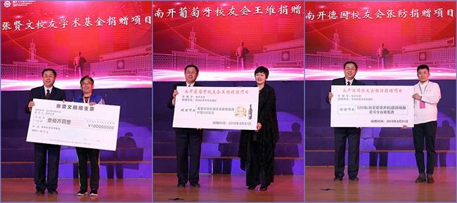 在百年校慶項目捐贈儀式中,張賢文校友捐贈人民幣一百萬元作為百年校慶學術基金,南開葡萄牙校友會王維校友捐贈價值100萬元的葡萄牙百年酒莊窖藏葡萄酒,南開德國校友會張防校友捐贈520瓶德國精釀雷司令白葡萄酒,為母校百年校慶獻禮,李義丹代表學校接受捐贈。