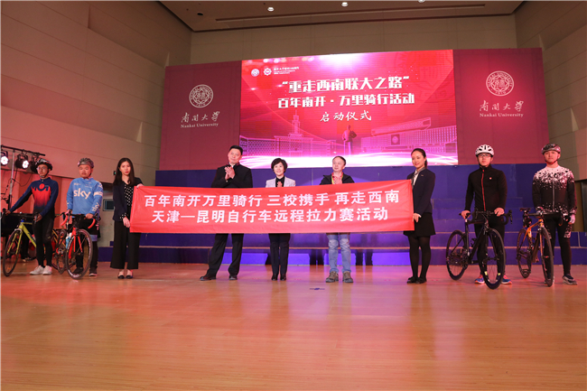 抗日戰(zhàn)爭期間,南開大學與北京大學、清華大學合組西南聯合大學。在南開大學百年校慶即將到來之際,“百年南開·萬里騎行”校慶紀念自行車遠程拉力賽正式啟動,重走西南聯大之路。該活動由南開大學百年校慶辦公室、南開校友總會、南開大學教育基金會、南開大學天津校友會及南開北京校友會共同主辦,將聯合北京大學、清華大學學子,從北京、天津騎行經長沙至昆明,全程3256公里,預計42天完成,吸引沿線近萬人參與。楊克欣與天津校友會、媒體校友會負責人一同展開宣傳橫幅。