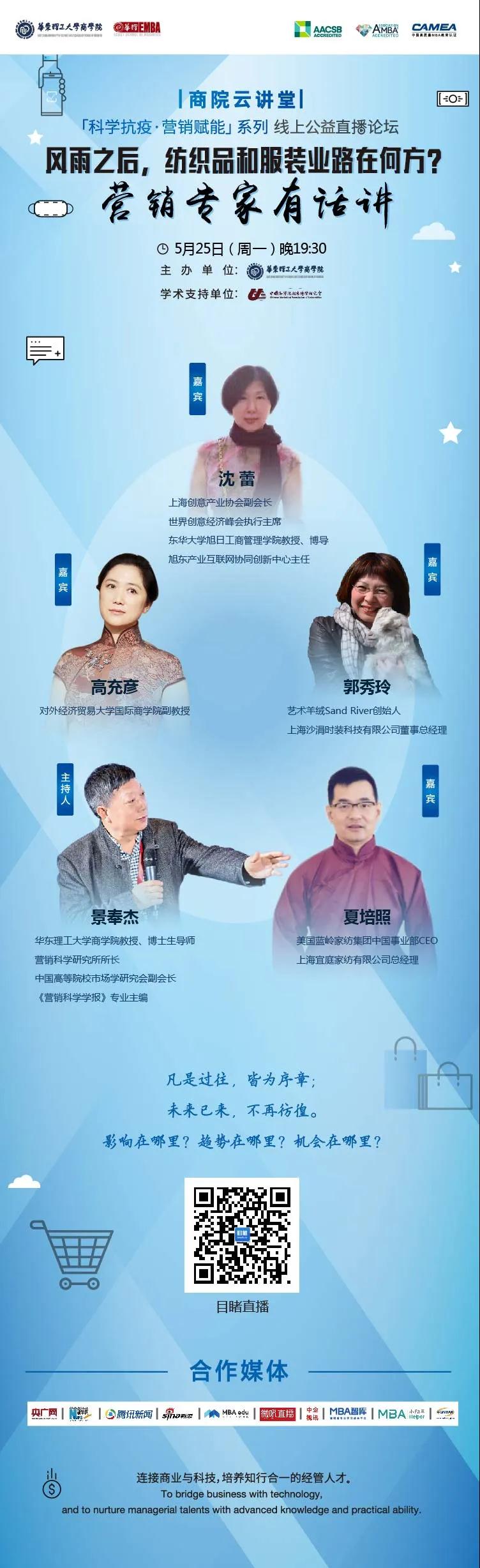 由華東理工大學(xué)商學(xué)院主辦,中國高等院校市場學(xué)研究會提供學(xué)術(shù)支持的“商院云講堂”【科學(xué)抗疫?營銷賦能】系列線上公益直播論壇已于3月16日正式上線!為您解析疫情下的營銷現(xiàn)狀、企業(yè)困局、管理疑問。賦能師生、校友,共克時艱,沉著應(yīng)對挑戰(zhàn)。