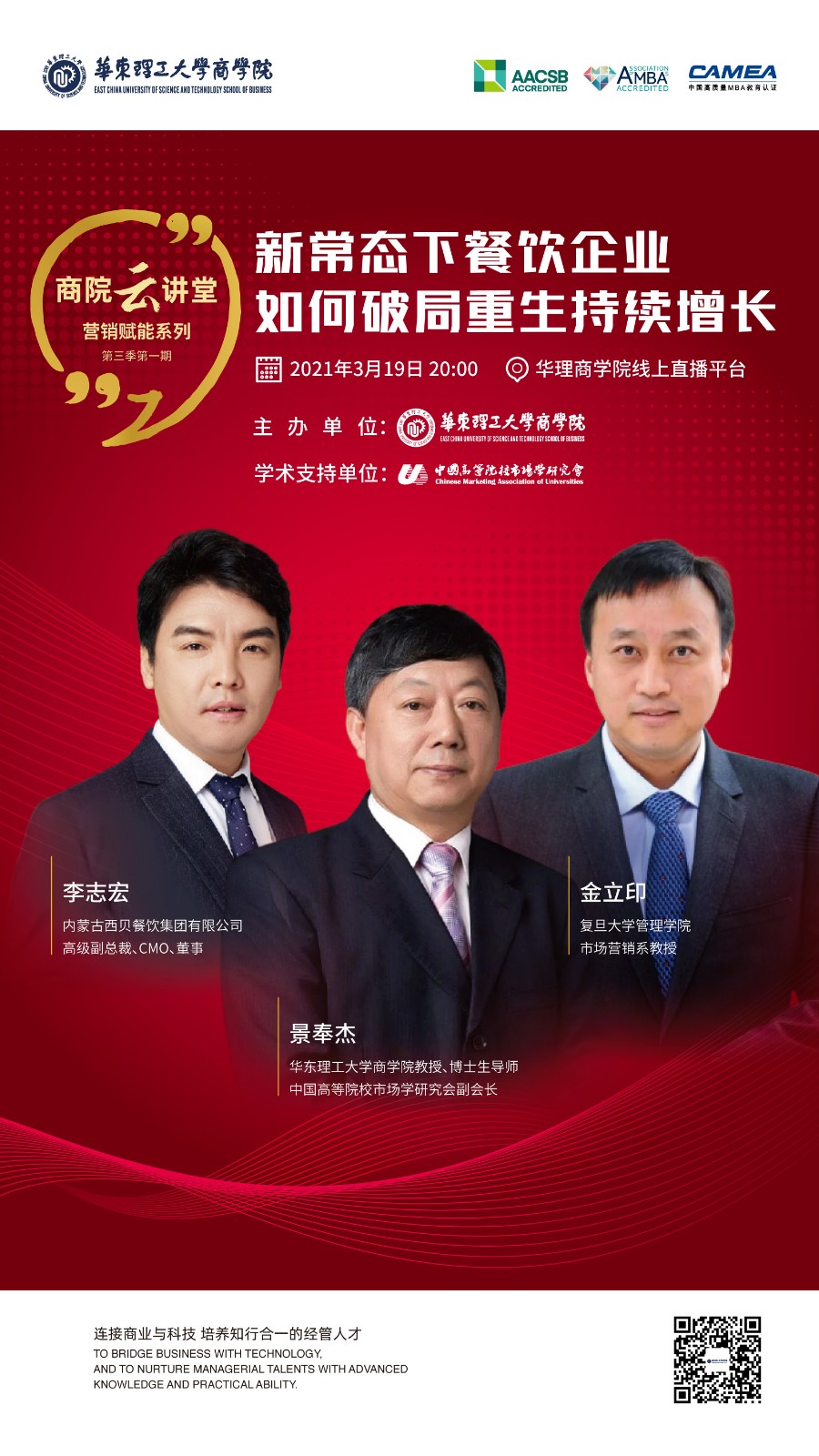 本期【商院云講堂】聚焦“新常態(tài)下餐飲企業(yè)如何破局重生持續(xù)增長(zhǎng)”,了解國(guó)內(nèi)頭部餐飲企業(yè)的“變革與思考”!邀請(qǐng)到內(nèi)蒙古西貝餐飲集團(tuán)有限公司高級(jí)副總裁、CMO、董事李志宏與復(fù)旦大學(xué)管理學(xué)院市場(chǎng)營(yíng)銷系教授金立印分享他們的精彩觀點(diǎn),直播由華東理工大學(xué)商學(xué)院教授、博士生導(dǎo)師,中國(guó)高等院校市場(chǎng)學(xué)研究會(huì)副會(huì)長(zhǎng)景奉杰主持。