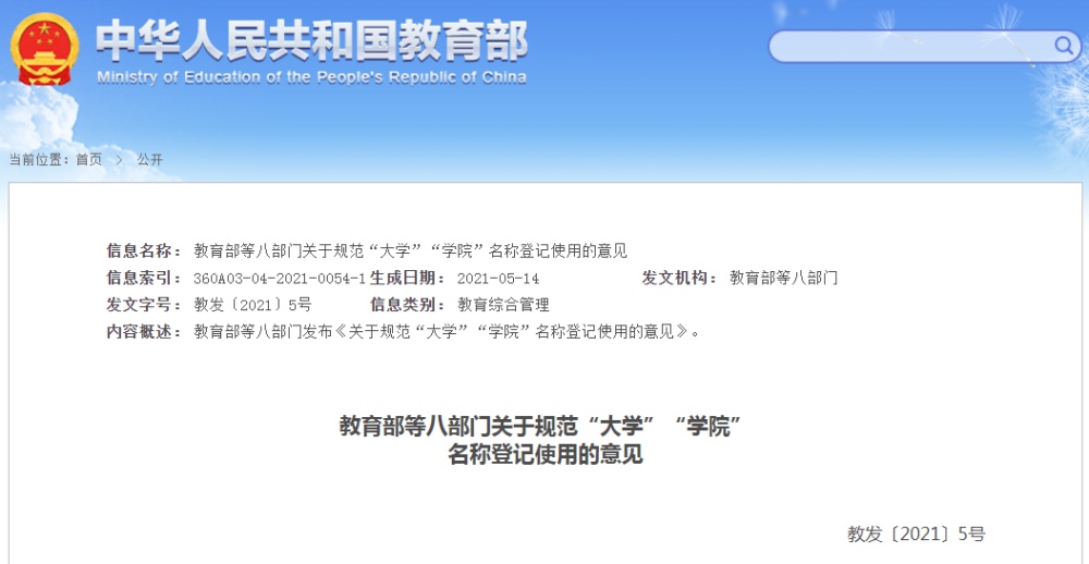 為全面清理整頓“大學(xué)”“學(xué)院”名稱使用亂象,日前,教育部等八部門發(fā)布《關(guān)于規(guī)范“大學(xué)”“學(xué)院”名稱登記使用的意見》(以下簡稱《意見》)明確,在機構(gòu)編制、民政、市場監(jiān)管部門登記時可以對應(yīng)使用“大學(xué)”“學(xué)院”字樣,其他組織機構(gòu)在登記時不得使用“大學(xué)”“學(xué)院”字樣。