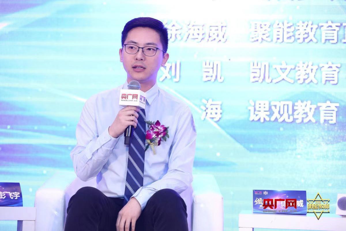 在圓桌論壇環(huán)節(jié)中,中央廣播電視總臺主持人張寶東,當代少年副總裁、思維與口才項目總監(jiān)彭飛宇,聚能教育直營事業(yè)部總經(jīng)理徐海威,凱文教育校長劉凱,課觀教育首席講師于海圍繞“新時代背景下教師如何緊跟時代發(fā)展”話題進行了深入討論。