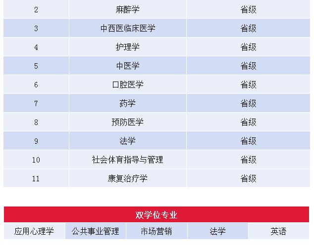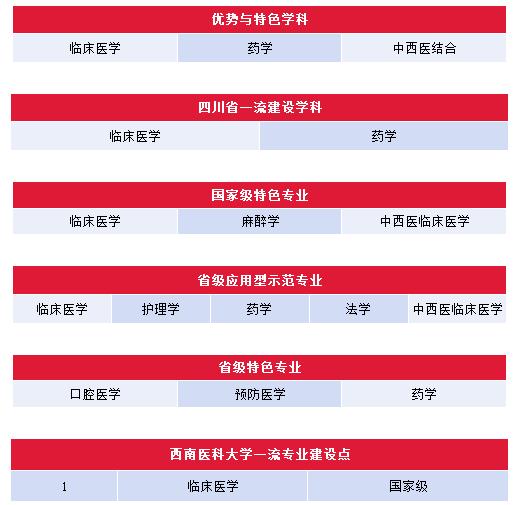 學(xué)校重視學(xué)科專業(yè)交叉融合,積極推進醫(yī)工、醫(yī)理、醫(yī)文結(jié)合,構(gòu)建了覆蓋“生命全周期、健康全過程”的醫(yī)學(xué)專業(yè)教育體系,F(xiàn)有一級學(xué)科碩士學(xué)位授權(quán)點7個,專業(yè)學(xué)位授權(quán)點9個;臨床醫(yī)學(xué),藥學(xué)及中西醫(yī)結(jié)合為我校的優(yōu)勢與特色學(xué)科;臨床醫(yī)學(xué)與藥學(xué)為四川省一流建設(shè)學(xué)科,其中臨床醫(yī)學(xué)在ESI全球排名中位于前1%,F(xiàn)有普通本科專業(yè)31個,涵蓋醫(yī)學(xué)、理學(xué)、工學(xué)、管理學(xué)、教育學(xué)、文學(xué)、法學(xué)等7個學(xué)科門類,其中,有國家級特色專業(yè)3個,省級應(yīng)用型示范專業(yè)5個,省級特色專業(yè)3個;國家級一流本科專業(yè)建設(shè)點1個,省級一流本科專業(yè)建設(shè)點10個,雙學(xué)位專業(yè)5個。
