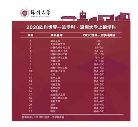 近年來,深大的學科建設發(fā)展迅速,工程學、臨床醫(yī)學、材料科學、生物學與生物化學、計算機科學、化學、物理學7個學科已進入ESI學科世界排名前1%。在6月最新發(fā)布的2020軟科世界一流學科排名中,深大有22個學科上榜,上榜學科數(shù)位列中國內(nèi)地高校第26位,領跑地方高校,其中通信工程、交通運輸工程、計算機科學與工程、納米科學與技術(shù)、材料科學與工程、能源科學與工程、儀器科學等7個學科進入世界前100。