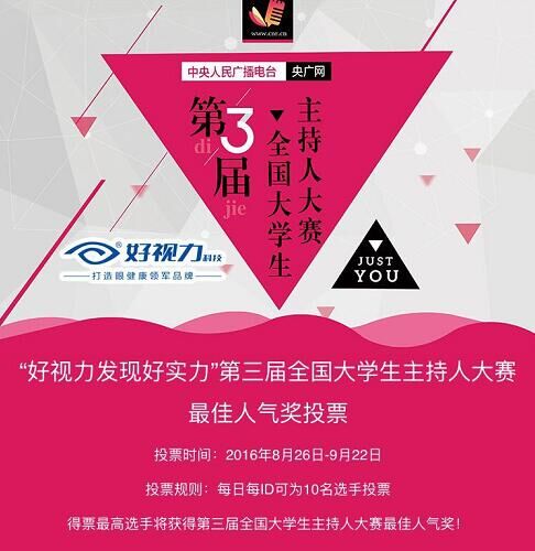 2016年8月26日,中央人民廣播電臺(tái)第三屆全國(guó)大學(xué)生主持人大賽“好視力發(fā)現(xiàn)好實(shí)力”最佳人氣獎(jiǎng)選手票選活動(dòng)全面開(kāi)啟,進(jìn)入全國(guó)復(fù)賽的71名選手參與了本次票選活動(dòng)。