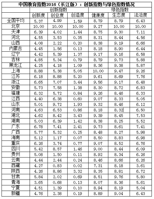 注:根據(jù)德爾菲法和層次分析法確定的權(quán)重,創(chuàng)新指數(shù)的綜合指數(shù)=創(chuàng)新度*29.70%+創(chuàng)業(yè)度*16.34%+創(chuàng)造度*53.96%;綠色指數(shù)的綜合指數(shù)=健康度*55.00%+生態(tài)度*20.98%+法治度*24.02%;中國教育指數(shù)2016的綜合指數(shù)=發(fā)展指數(shù)*55.00%+創(chuàng)新指數(shù)*24.02%+綠色指數(shù)*20.98%。