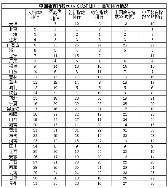 長江教育研究院發(fā)布中國教育指數(shù)2016。指數(shù)排名依次為北京、上海和江蘇,其指數(shù)均高于7.00;指數(shù)處于6.00-7.00較高檔位的還有廣東、浙江和湖北。此外,與2015年相比,天津、甘肅兩地全國排名進(jìn)步明顯。中國教育指數(shù)2016創(chuàng)造性地提出了教育“綠色指數(shù)”與教育“法治度”,力求全面反映國家和地方教育生態(tài)及其發(fā)展的健康水平、法治水平和科學(xué)持續(xù)性。