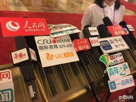 #2017看兩會(huì)#部長通道里各路記者就位,話筒架已被占滿。(人民網(wǎng)前方報(bào)道組趙艷紅攝)