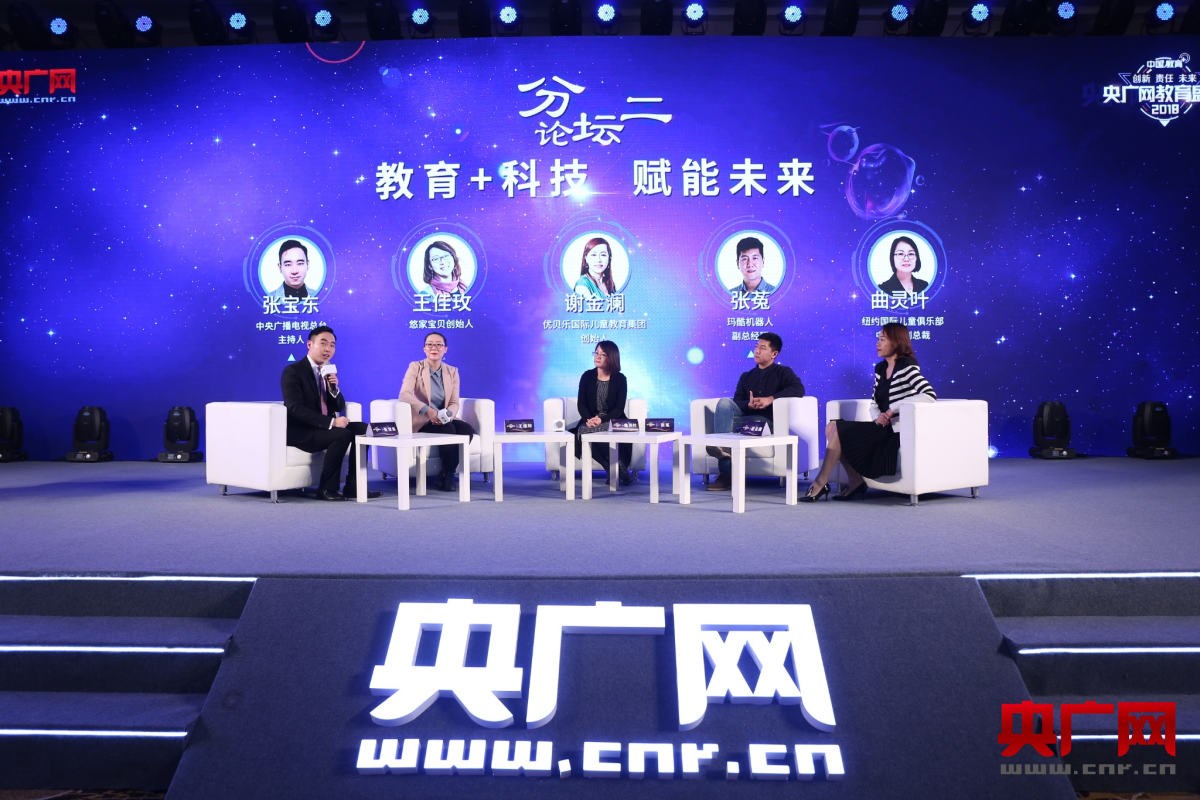 新的科技革命對(duì)人類社會(huì)、學(xué)校形態(tài)、學(xué)校價(jià)值追求產(chǎn)生了巨大沖擊,在人工智能革命下,未來教育已經(jīng)破殼而出,未來教育不是對(duì)今天教育的推倒重來,而是從今天的教育出發(fā),通過逐步變革實(shí)現(xiàn)的。那么,教育+科技,如何改變現(xiàn)在,賦能未來?中央廣播電視總臺(tái)主持人張寶東、悠家寶貝創(chuàng)始人王佳玫、優(yōu)貝樂國際兒童教育集團(tuán)創(chuàng)始人謝金瀾、瑪酷機(jī)器人副總經(jīng)理張菟、紐約國際兒童俱樂部中國區(qū)副總裁曲靈葉,共同做客2018中國教育+峰會(huì)暨央廣網(wǎng)教育盛典“教育+科技 賦能未來”分論壇,以圓桌會(huì)議的形式探討教育的發(fā)展與未來,以下為圓桌論壇實(shí)錄: